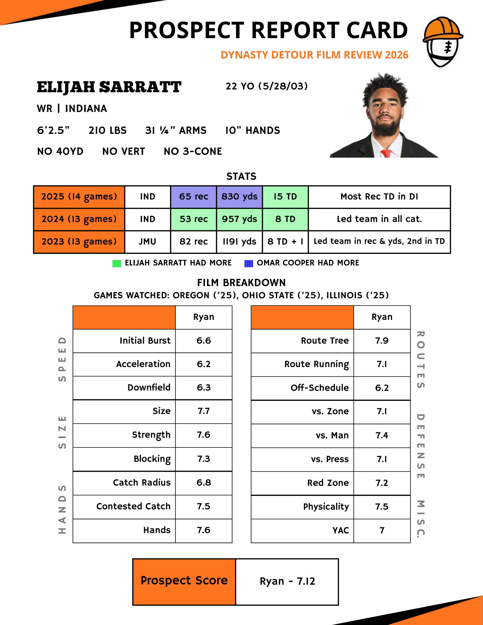 Tyson’s senior season at Arizona State was full of impressive moments, but the loss of QB Sam Leavitt Week 7 and Tyson’s own three game absence due to a hamstring injury kept it from rivaling some other receivers in this class statistically. The injury supposedly continues to flare up, resulting in him skipping combine testing, and adds to a college injury history including an ACL, MCL, and PCL tear his freshman year that carried through his entire sophomore season and a fractured collarbone in his junior year that caused him to miss the Big 12 championship. When healthy, Tyson proved to be one of the most well-rounded weapons in the college game, but I see some limits to what he' could become, even with perfect health.