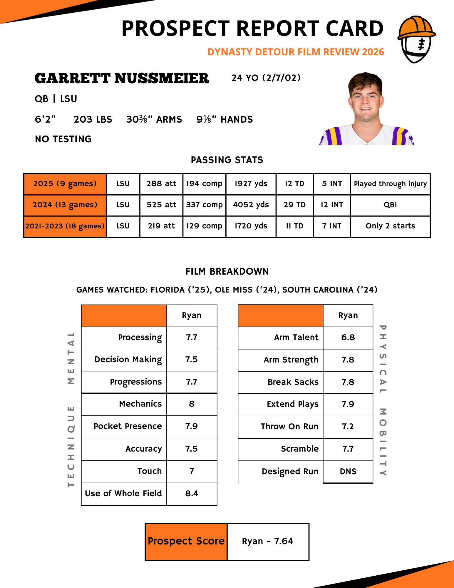 Nussmeier’s camp revealed to teams at the combine that he played through an oblique injury for the 2025 season before being shut down towards the end of the year. We have no way of knowing exactly how much it affected him, but I did think his tape in 2024 did look better. Whether the injury was the only reason for his regression or not, I thought he still put some decent stuff on tape. I was impressed by his composure in the pocket and his accuracy on routine throws. Adding in an NFL-caliber arm, good processing, and his confidence in throwing the ball deep and into tight windows, I think he could definitely start at the pro level. He needs to mature a bit when it comes to his tendencies to gamble on certain throws, staring down receivers, and getting the ball out on time, and I do think he’ll be susceptible to confusion versus elite defensive schemes, but I would certainly not rule out his ability to develop these things. His ballsiness testing defensive backs is something that can’t be coached, and I think coupled with development of some more fundamental traits, gives him upside versus more conservative passers. His comp for me is a slightly smaller Geno Smith, who we know required quite some time before consistent success came and is reliant on being a part of well run offenses with strong supporting casts. That said, if you get all these pieces around him and coach him well, he could be a consistent fantasy QB2.