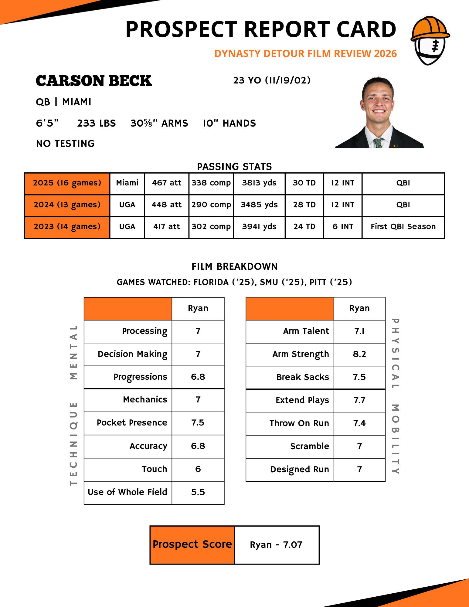 I suppose there’s potential, but I’d need to see a pretty good landing spot before I think about spending any kind of consequential draft capital on Beck. He comes with about as much big game experience and experience as a starter of anyone in the class, and his frame is certainly among the best. Neither seems to do him a whole lot of favors, though. His mechanics were flat out upsetting at times, something that without a doubt contributed to his ball placement and touch problems. He seemed to have the arm for deep balls and outside-the-number throws, but whether it was a confidence, processing, or arm issue he rarely used it. There were definitely flashes of some nice off-schedule extension of plays and throws on the run, enough to not completely rule him out. He has some capabilities as a runner too. All-in-all, I comp him to guys like Desmond Ridder. It’s not my favorite comp of all time in terms of playstyle, but the two are similar in terms of having a definite ceiling as a routine passer and a touch of mobility and arm talent. So yeah, sorry Carson.